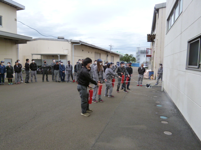 予定より遅れておりました、防災訓練を行いました。 避難訓練後、防火管理者が水消火器の使用説明をしています。 説明後、消火訓練を行いました。 -